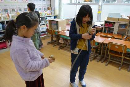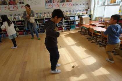 こま回しのコーナーでは,せっせと紐をまきつけて・・・