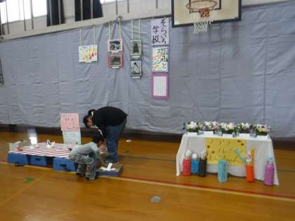 交流作品では,盲学校・二条城北・北総合支援学校に通っている大宮校区にすんでいるお友だちの作品が展示されました。鑑賞していた子どもたちが「すごいな!クオリテイが高いな!」という声が聞こえました。