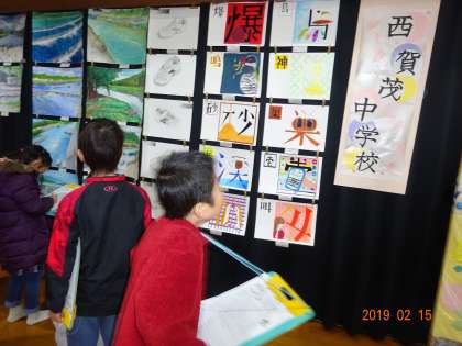 図工展の鑑賞をしました。他の学年の作品を見て,「ここ丁寧に作ったはるね。」や「すごい細かいところまでやってはる〜」など声が聞こえてきました。また中学生の作品もあり,「中学生の作品すごいな。」「色がきれい」など言っていました。