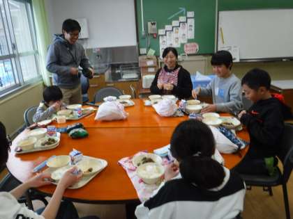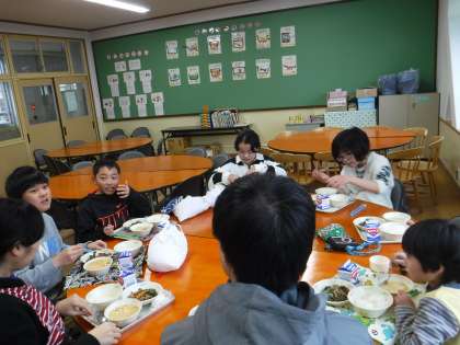 今年度最後のランチルームでの給食でした。メニューは,牛乳・ご飯・プルコギ・中華コーンスープでした。「ニラは,苦手やけどお肉と一緒に食べたらおいしいわ!」「ニラは,栄養あるよ!」と栄養教諭のM先生。6年生にとっては,最後のランチルームとなりました。