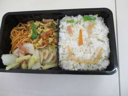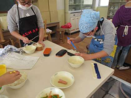 家庭科の学習でお弁当作りをしました。自分たちで食材を考え,調理中…
