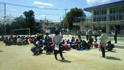 11時すぎに1年生が帰る用意をして運動場に集まってきました。