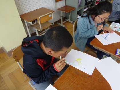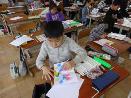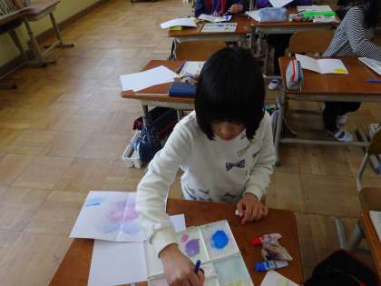 図画工作科「まぼろしの花」の単元をやりました。デカルコマニーや吹き流しの技法を学習しました。できた模様を使いながら,まぼろしの花を想像し,素敵な作品が完成しました。色々な色や模様ができて,楽しみながら学習できました。