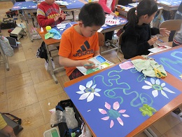 完成した作品を見てみると,「宇宙に咲いている花」や,「ガラスのように光る花」など,子どもたちがイメージした花を表現することができていました。