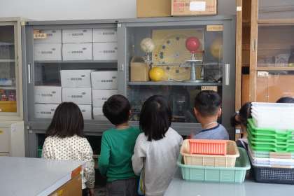理科室では,準備室の中も見せてもらい,たくさんの実験道具や模型に興味深々!