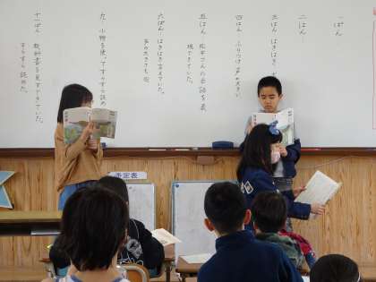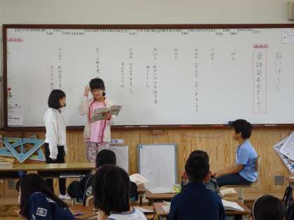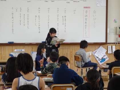 白いぼうしの音読発表会をしました。情景描写や松井さんの行動を読み取り,振り付けを考えたり,台詞の言い方を工夫したりしていました。短い練習時間でも,素晴らしい発表会になりました。