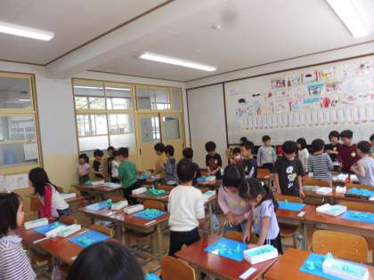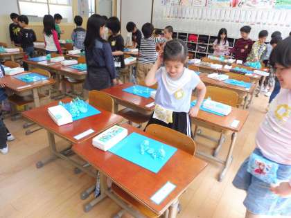 活動の後は,出来上がった友だちの作品のよいところを見つけるために,他の友だちの作品を見てまわりました。おもしろい作品がたくさんありましたね♪