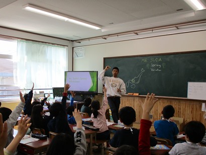 ALTの先生の春休みのお話を聞きました。ほとんど英語でのお話でしたが,子どもたちは知っている言葉や,写真やイラスト,先生のジェスチャーなどから意味を考え,とても楽しそうに聞いていました。