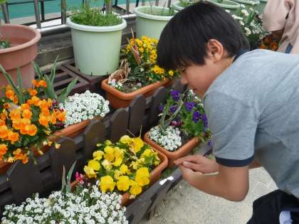 園芸委員会は,「二葉葵の苗」植えと体育館前の花壇の花がらつみをしました。つんで水やりをすると花がいきいきします。「これはつんでもいいかな?」「あっ球根が出てきた!チューリップや!」と活動しました。
