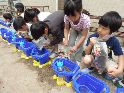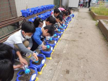 生活科の学習であさがおの種を観察し,まきました。それぞれ願いを込めながら土を入れ,種をまき,水をやりました。