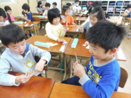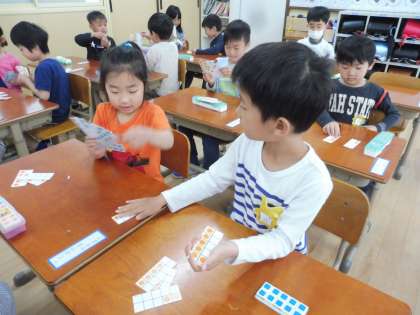 この日は,数を並べたり,比べたり,数えたりしました。最後は,ペアの友だちとカードを出し合い,大きい方が勝ちというゲームをしました。ゲームは大盛り上がりで,楽しく学習することができました♪