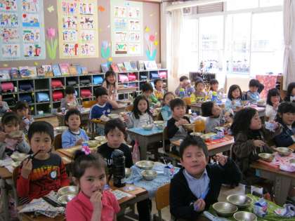 学校給食がはじまりました。みんなおいしそうに食べています。