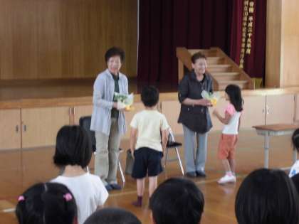 いつも子どもたちを見守っていただいている女性会の方への感謝の気持ちをこめて,生活科の学習で大切に育てたアサガオの苗と歌のプレゼントをしました。女性会のみなさんに喜んでもらえてよかったですね♪