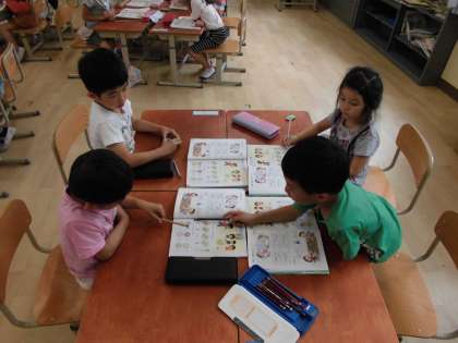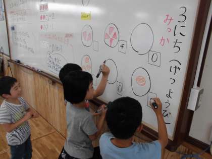 今週の算数は「いくつといくつ」の学習をしました。“10は4と6に分けられる”など,数図ブロックをお皿の上の苺などに見立てて操作しながら考えました。「0」という数について友だちと話し合ったり,おはじき遊びをしたりしながら学習しています。