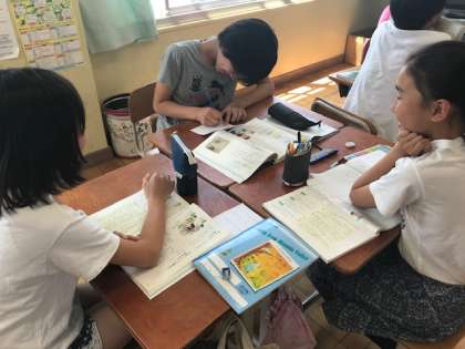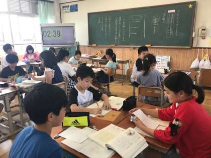国語の学習「きいて,きいて,きいてみよう」では,自分たちの考えたインタビューをしました。前回の学習のむずかしかったところを確認しながら,三人で役割を決めて学習に取り組みました。
