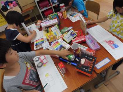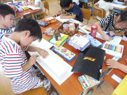 積み木を使って絵を描いた後,せっかくなので,お家の人に用意してもらった箱でも絵を描いてみました。積み木のように決まった大きさではありませんが,それぞれの箱・形の特徴を活かしながら,楽しい絵を描いていました♪