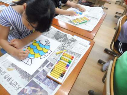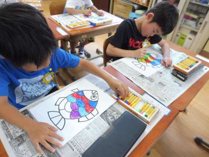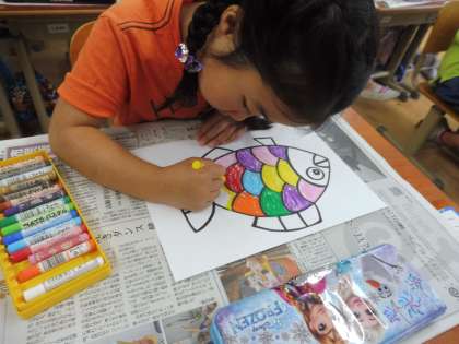 クレパスで上手に色を塗っていきます。今回は「線からはみ出さないように塗ること」がめあてだったので,みんなゆっくりていねいにがんばりました。