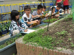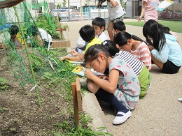 子どもたちは,1年生が育てているアサガオと比べながら,