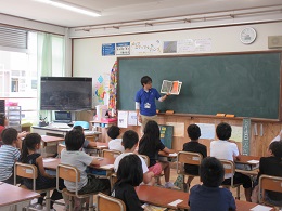 あじさい読書週間の取組で,4年生のクラスに他の学年の先生が絵本の読み聞かせに来てくださいました。