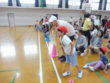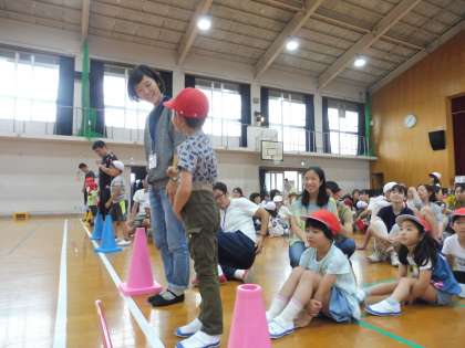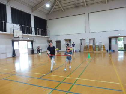 今回は,保護者のみなさんと台風の目をしました。お家の人たちと協力して,棒を持ちながら走ります。とても楽しい時間になりましたね。