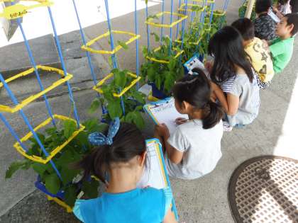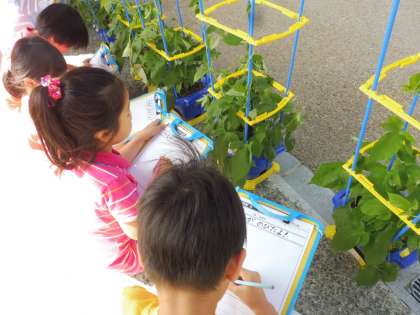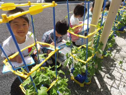あさがおがどんどん大きくなってきています。つるがのびてきたので支柱を立てて,観察を続けています。