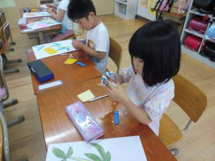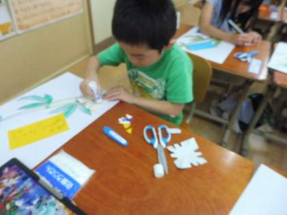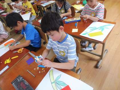 短冊にお願いごとを書いて,折り紙で飾りを製作中です。子どもたちの得意なチョキチョキ飾りもまわりに貼ります。完成が楽しみですね♪