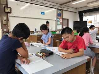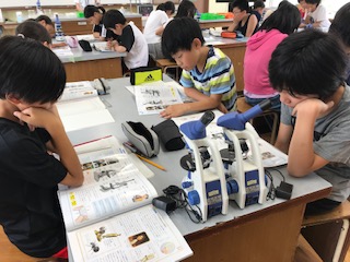 今日の理科の学習では,単眼顕微鏡を使って,文字を見たり,