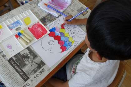 さかなのうろこを,全て違う色でぬれるように意識しながら,