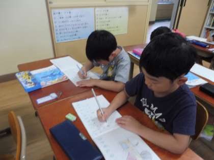ノートに問題・式・答えを書いて考えます。今までよりもたくさん書くことが増えて,今日はとても大変だったのですが,授業が終わってから,「ちょっと楽しかった!」「またやりたい!」という声がたくさん聞こえました。明日の学習も楽しみですね♪