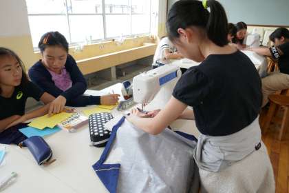 家庭科の学習でエプロンを作っています。今はミシンをしています。