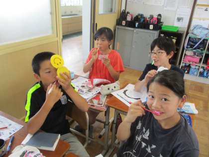 毎年行っている歯みがき指導。毎年していても,毎年歯はピンク色に染まります。