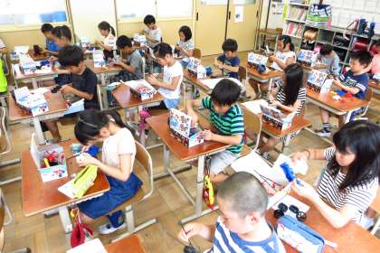 電池のつなぎ方を変えると速さが変わったり,電池の向きを変えると進む方向が変わったりする様子を楽しんでいました。