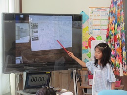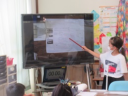 予想の全体交流では,テレビにワークシートを映し出し,友だちにもわかりやすいように発表していきました。