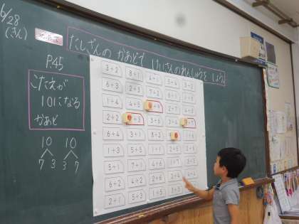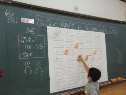 答えが10になるカードを探します。音読で「10はいくつといくつ」を頑張っている子どもたちは,すらすらと10になるカードを選んでいました。
