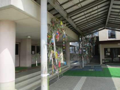 体育館の前に,七夕会で願い事を書いた笹が飾られています。