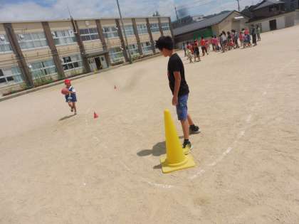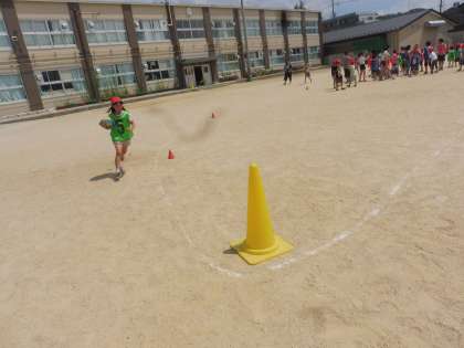輪っかのバトンやボールのバトンを使って,みんな一生懸命走りました。6年生にたくさん応援してもらって,がんばって走った1年生です。