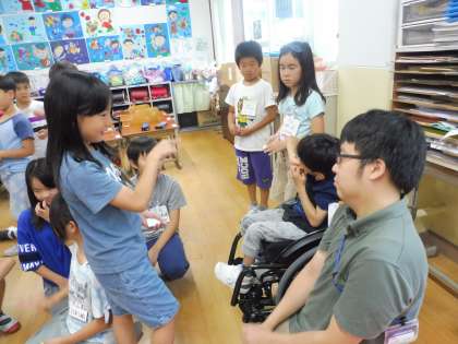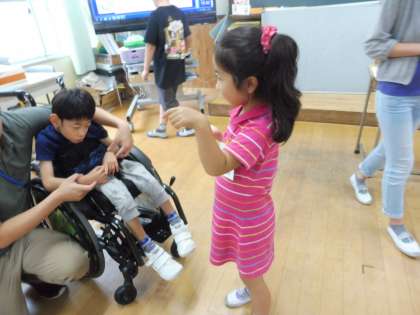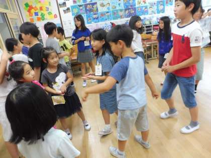 1−3の教室では,「無言ゲーム」をしました。配られたカードにかかれた果物を無言で伝え合って仲間を探します。1年生は,果物の形を指であらわしながら,同じカードの人を探していました♪