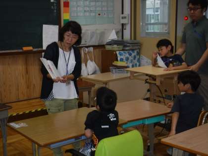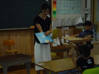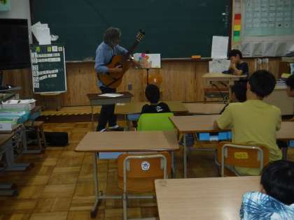 PTAサークル お話の会もこもこさんが読み聞かせに来てくださいました。「おやゆびさん・ぷかぷか・へそとりごろべえ・みずくみに」の4冊を読んでいただきました。「おやゆび」はギターの弾き語りでした。