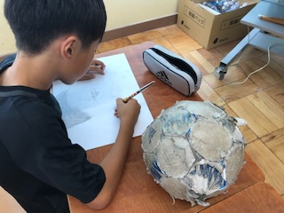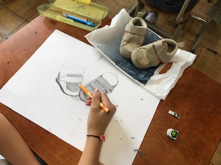 子どもたちは,ずっとつかっていたサッカーボール,ファーストシューズ,思い出のキーホルダーやいつもかぶっている帽子など,それぞれの思い出の詰まったものをデッサンしています。