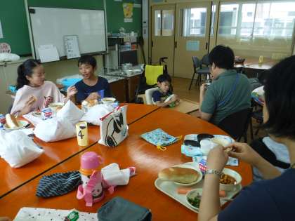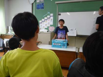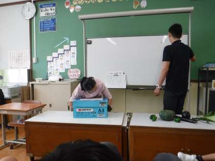 「これは、何でしょう?」クイズをランチルームでしました。栄養教諭のT先生が食育のお話のためにクイズを考えてくださいました。高学年が,箱に入ってある物を手で触ってわかったのをみんなにヒントを出してくれます。それをみんなで当てます。NGワードがあるのでヒントを出すのも難しいのですが,今まで畑で育てた経験から「去年育てた野菜です。」「マヨネーズをかけるとおいしいです。」「緑色です。」「焼いて食べて好きになりました。」とヒントを出してくれました。「正解は,ズッキーニ!でした。」「やった!」と喜ぶみんなでした。