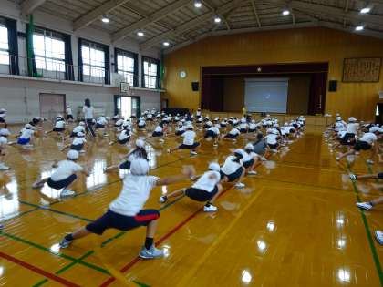 今日から学年全体で「ソーラン節」の練習が始まりました。腰を低くしたり,動きをそろえたりするのが難しいですが,子ども達は一生懸命練習していました。