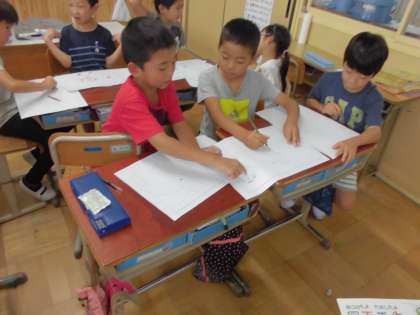 一度自分でかいたあと,同じ場面をかいた子たちと見せ合いながら交流しました。