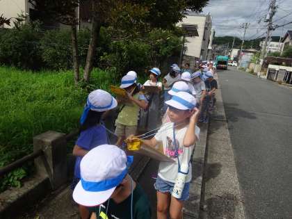 社会科「火事からくらしを守る」で,わたしたちの地域にはどのような消防設備があるのか探検しにいきました。「これも消防設備なんだ!」「学校と比べると設備が少ないな」などの声がありました。来週,消防署に社会見学に行きさらに学習を深めていきます。