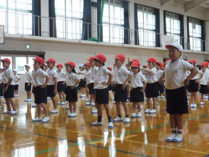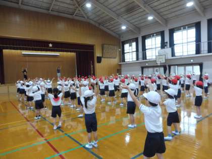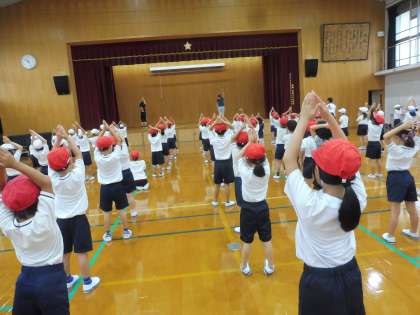 大きなダンスのフリで,笑顔で踊る素敵な1年生がたくさんです♪