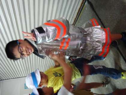 防護服を着させていただきました。防護服は20キログラムもあることを知りました。子ども達からは「重たい!」「暑い!」などの声が上がっていました。