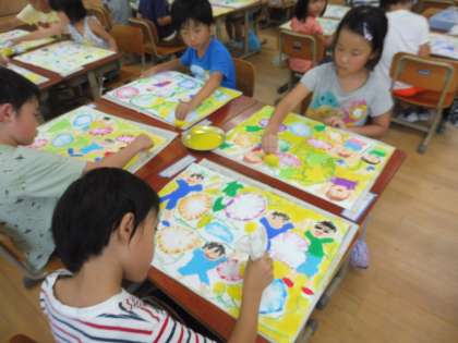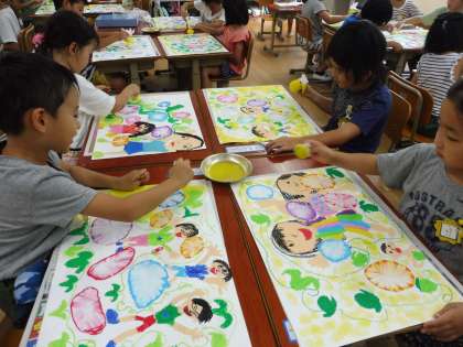 「ポン・ポン・ポン」と言いながら,優しく色つけする子どもたちでした。人によって,色の濃さがちがったり,グラデーションになっていたり,それぞれ素敵な作品が出来上がりました。