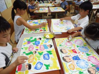 あさがおの絵の仕上げをしました。お家の方に作ってもらったタンポに絵の具をつけて,ポン・ポン・ポン♪
