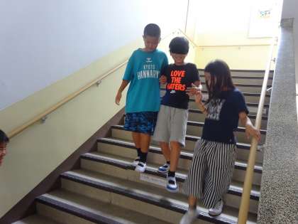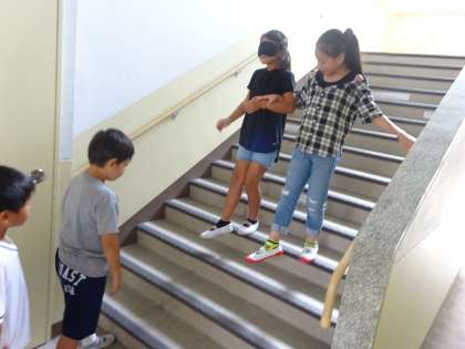 アイマスク体験を終えたあとの振り返りでは,「曲がり角と階段の最後の段が怖いな」や「町中にでるともっとこわいと思うな」「目の不自由なひとはどうやって生活してるんだろう」などの感想があがりました。今後,総合の学習でさらに調べていきたいと思います。