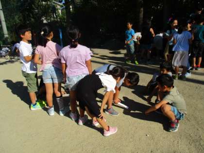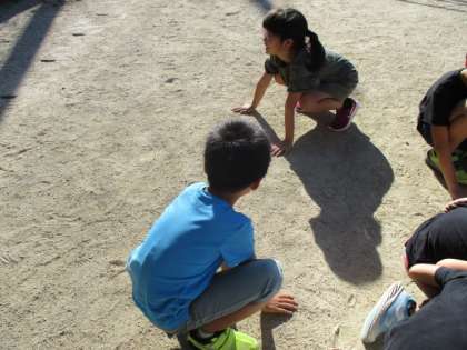 日なたと日かげの地面の様子はどのように違うのかな?実際に運動場に出て,温かさやしめり具合などを調べました。今回は初めて温度計も使い,地面の温度を測って比較しました。手のひらと道具の両方で,違いを実感していました。