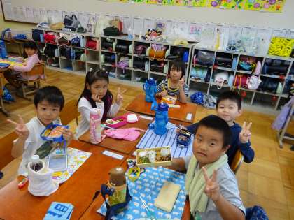 今日はあいにくの天気で運動会が延期になってしまいました。少し残念な気持ちの朝でしたが,お昼はおうちの人が作ってくれたお弁当でみんなにこにこ笑顔になっていました。教室では「見て見て!」と言う声がたくさん聞こえ,嬉しそうにお弁当を見せてくれました。おいしいお弁当を用意していただきありがとうございました!